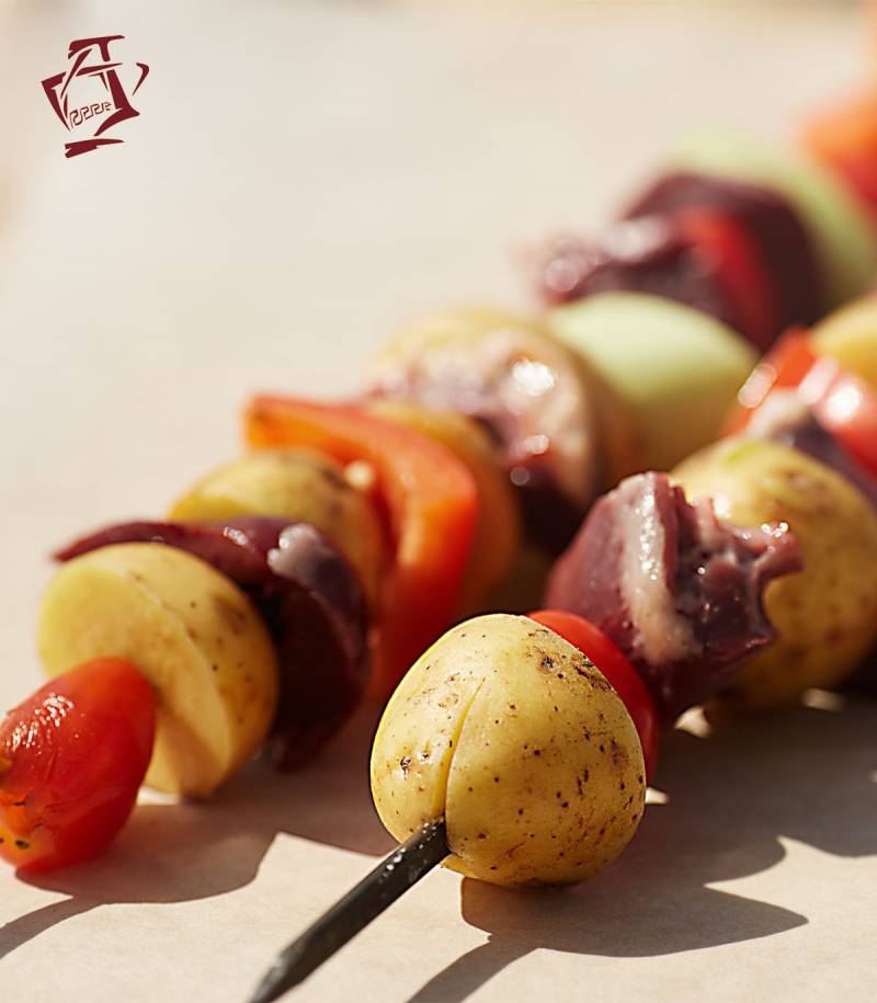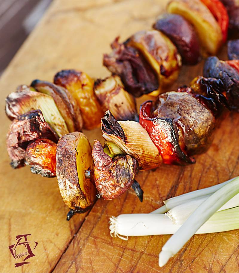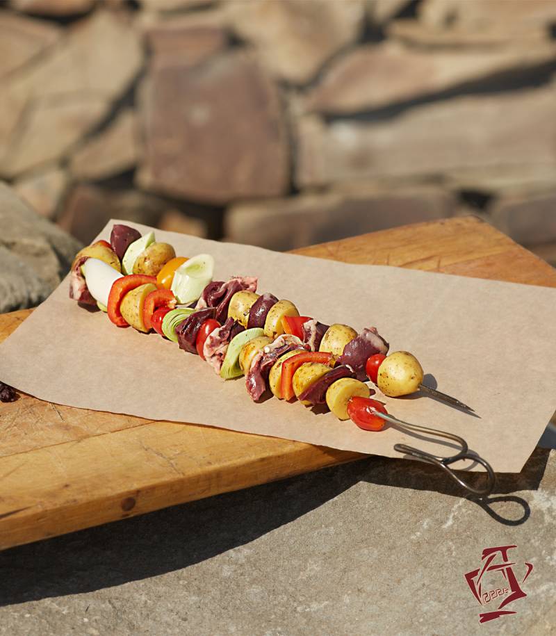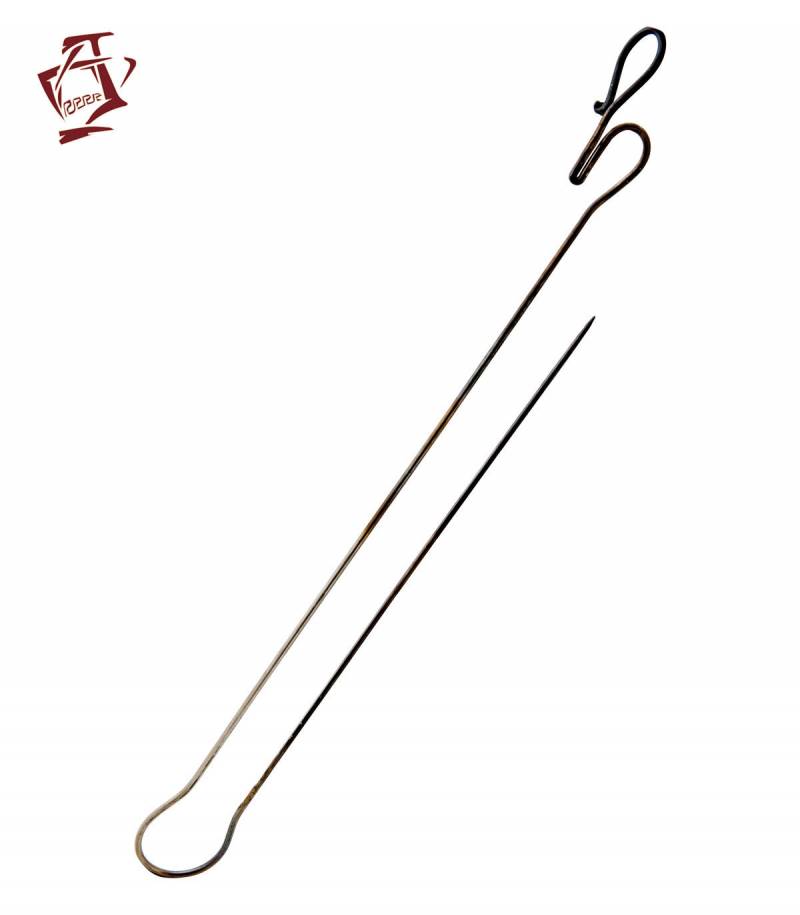 Der doppelte Haken geschmiedet bietet sich bestens dafür an, kleine Produkte wie, bspw. Pilze, Gemüse, Shrimps, Kartoffeln uvm. nacheinander aufzuspießen und anschließend im Tandoor-Ofen zu garen / grillen.