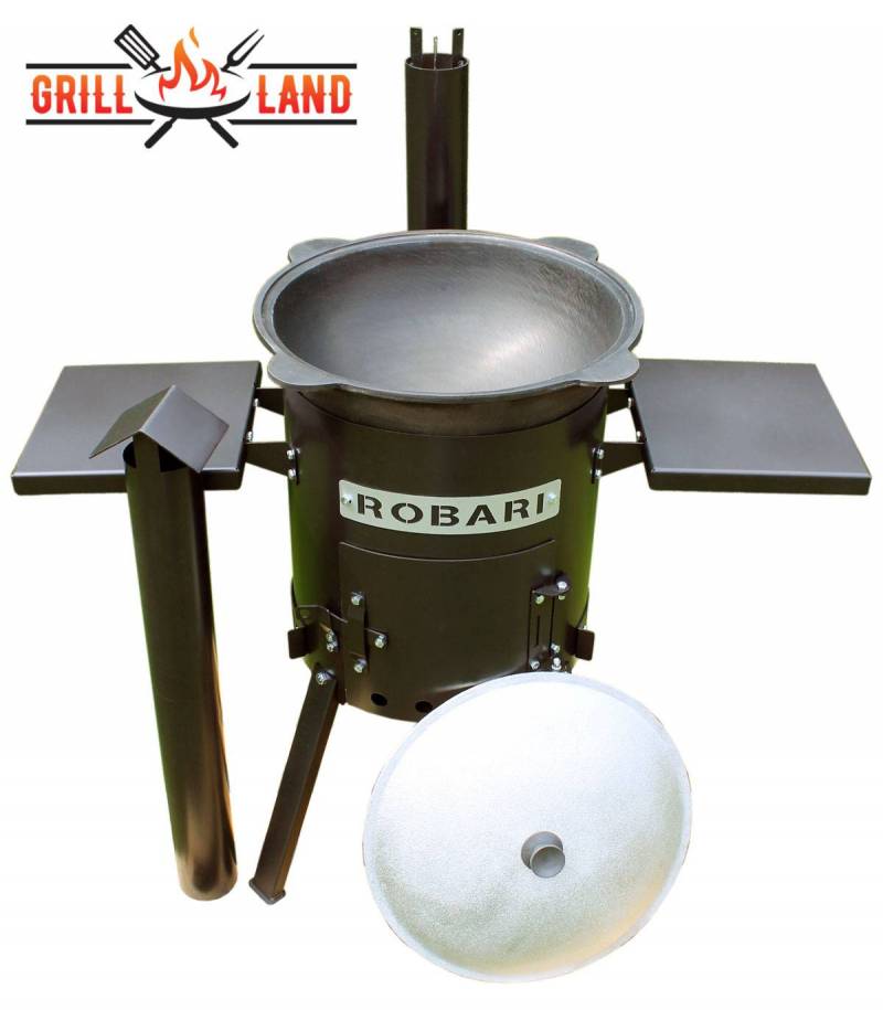SET Feuerofen UST36 mit Schornstein und 2 Ablagen mit Kazan usbekisch 12 Liter aus Gusseisen mit Aludeckel, Boden rund