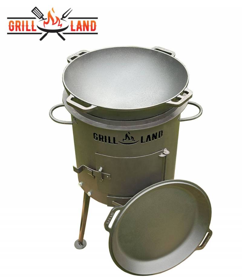Set Feuerofen/Uchag Ø37 cm Grill-Land, Stahl 3 mm mit 12L Kazan Gusseisen Robari mit Pfannendeckel aus Gusseisen