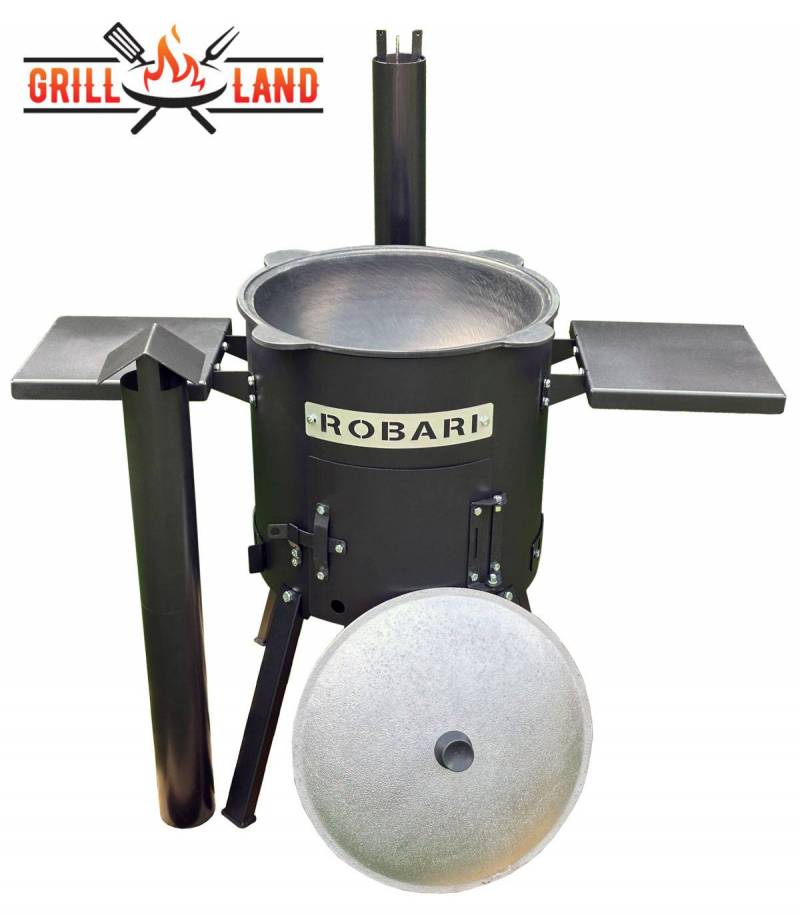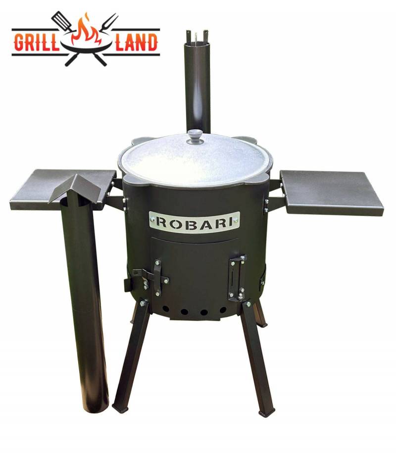 SET Feuerofen UST40 mit Schornstein und 2 Ablagen mit Kazan usbekisch 12 Liter aus Gusseisen mit Aludeckel, Boden rund