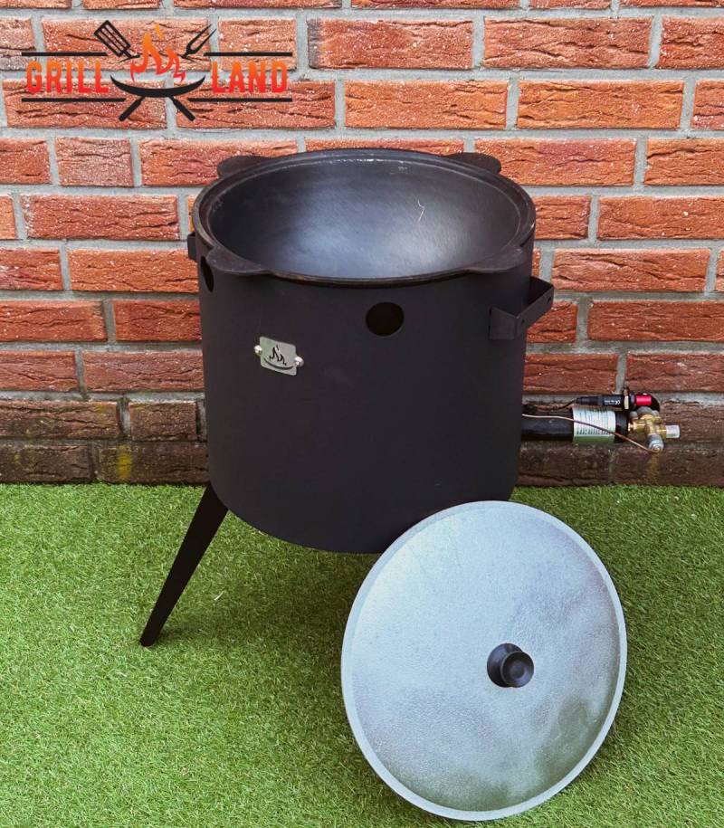 SET Gas-Feuerofen Utschak KOMFORT 37 cm, Stahl 3mm, mit 10L Kazan Usbekisch, aus Gusseisen mit Aludeckel, Boden flach