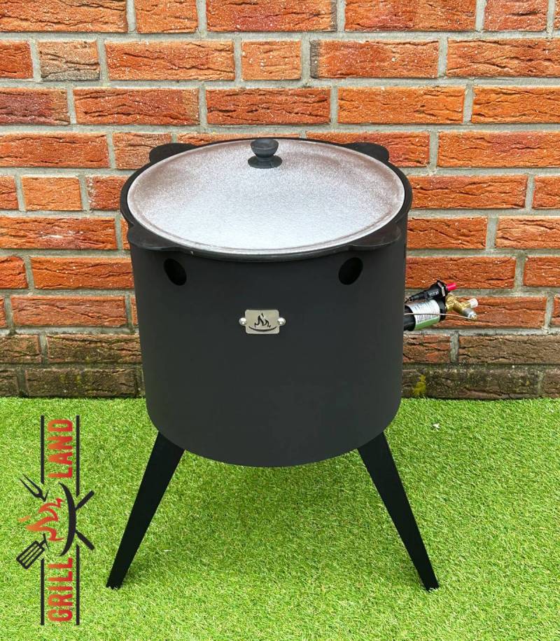 Feuerofen KOMFORT 40 cm, 3-Fuß Hockerkocher, 3 Adapter für Hockerkocher, 12L Kazan Usbekisch, aus Gusseisen mit Aludeckel, Boden flach.