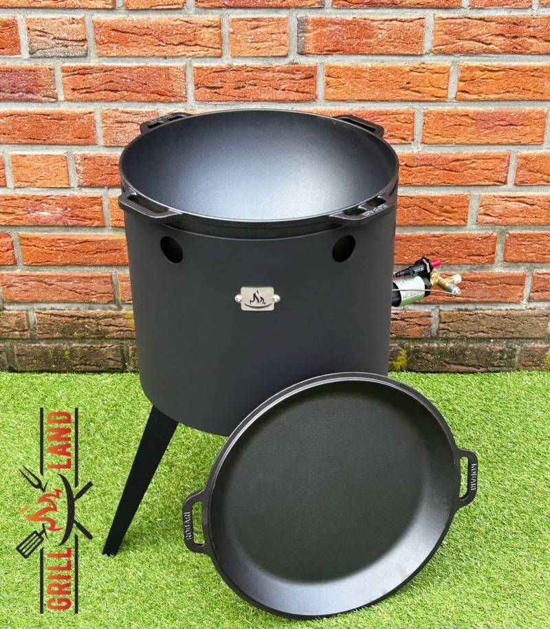 Feuerofen KOMFORT 40 cm, 3-Fuß Hockerkocher, 3 Adapter für Hockerkocher, 15 Liter Kazan Gusseisen Robari mit Pfannendeckel aus Gusseisen.