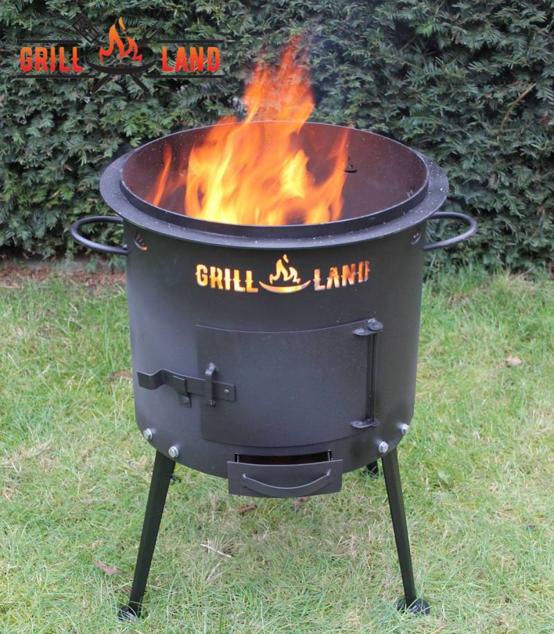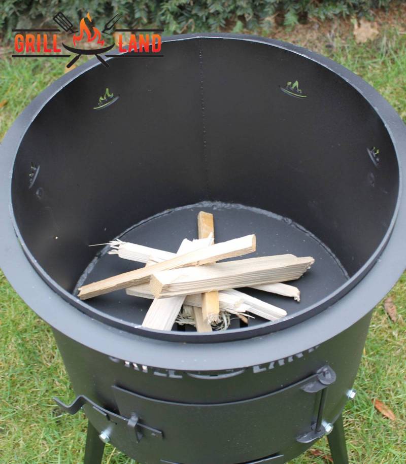Set Holzofen/Uchag "Grill-Land", Ø37 cm für Kazan/Kasan, Stahl 3 mm mit Kazan Usbekisch Asien 10 Liter aus Gusseisen mit Aludeckel, Boden flach